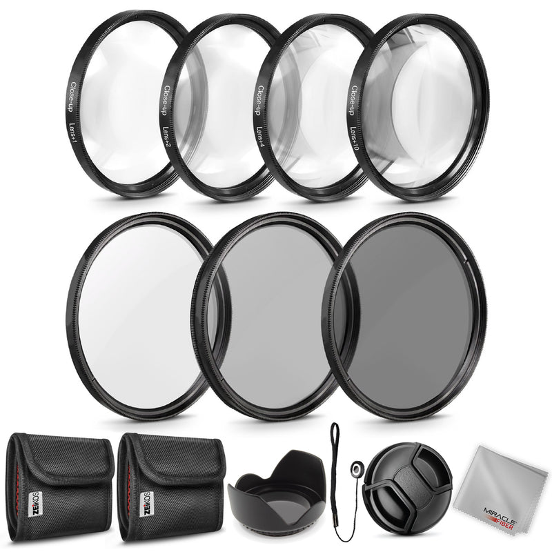 - Kit Includes: Seiko's 67MM Filter Kit (Ultraviolet UV, Circular Polarizer CPL, Fluorescent FLD) + Macro Close-Up Set (+1, +2, +4, +10) + Filter Carry Pouch + Tulip Flower Lens Hood + Center Pinch Lens Cap w/ Cap Keeper Leash + Miracle Fiber Microfiber Lens Cleaning Cloth.